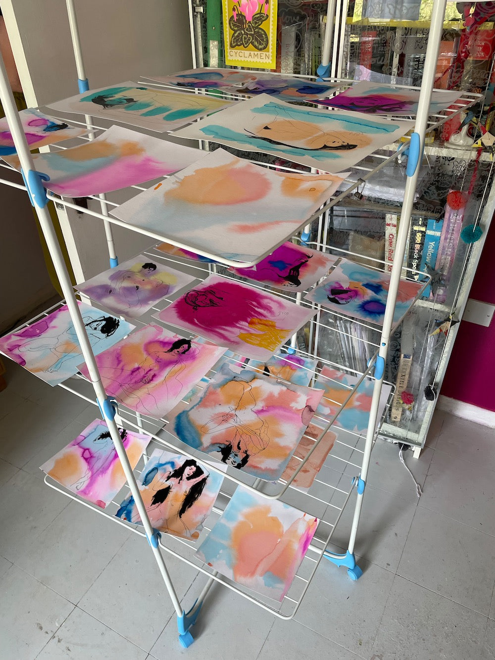 Catch new work at the earliest stages. Understand the questions I'm asking and the decisions I make. It's all about the infinite number of choices. Blue or red? 10cm tall or 1m? Pile of bricks in the centre of a white room, or sunset colours dripping from paper?